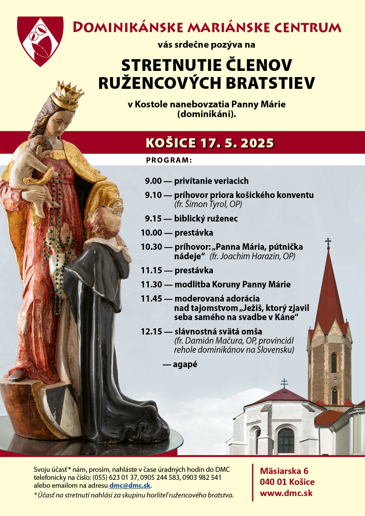 Milé ruženčiarky, milí ruženčiari! Otcovia dominikáni – oddaní milovníci Panny Márie a modlitby ruženca – pre Vám aj tento rok pripravili Stretnutie členov ružencových bratstiev! Uskutoční sa v Košiciach, v Kostole Nanebovzatia Panny Márie, vo všeobecnosti sa tento kostol nazýva Dominikánsky kostol, a bude to v sobotu, 17. mája 2025. Program začne o 9-tej hodine privítaním veriacich a krátko na to, o 9:10 bude príhovor priora košického konventu, fr. Šimona Tyrola. O 9:15 bude, ako sa na stretnutie ruženčiarov patrí, modlitba biblického ruženca. Od 10-tej hodiny začne prestávka až do 10:30, keď bude mať fr. Joachim Harazin, asistent promótora pre ruženec, príhovor na tému „Panna Mária, pútnička nádeje.“ Po jeho skončení opäť bude krátka prestávka a po nej modlitba Koruny Panny Márie. Za ňou bude nasledovať moderovaná adorácia nad tajomstvom ruženca „Ježiš, ktorý zjavil seba samého na svadbe v Káne.“ Krátko po poludní, o 12:15 bude nasledovať slávnostná svätá omša celebrovaná fr. Damiánom Mačurom, predstaveným rehole dominikánov na Slovensku. Po jej skončení bude pre pútnikov pripravené agapé. Drahí ruženčiari, pokiaľ Vám to povinnosti dovolia, bolo by dobré, pokiaľ by ste sa zúčastnili tohto stretnutia, veď je to organizované práve pre vás, pre ruženčiarov. Som si istý, že vďaka tomuto stretnutiu môžete prehĺbiť svoju vieru, rozšíriť si vedomosti, získať ďalšiu energiu do duchovného života, vystúpiť zo stereotypu a v neposlednom rade aj spoznať iných ruženčiarov. Keďže ste organizovaní ako bratstvo, bolo by lepšie, aby ste sa stretnutia zúčastnili skupinovo, ako celé bratstvo či dokonca farnosť. ŽDAŇAV milostivom roku 2025, v sobotu 8. marca 2025 navštívili Ružencovú záhradu ako prví organizovaní pútnici v tomto roku veriaci, členovia Ružencového bratstva z obce Ždaňa. Vzhľadom na takýto dátum ich privítalo pekné, jarné slnečné počasie. V úvode svojej púte navštívili náš kostol, ktorý je zasvätený sv. Kataríne Alexandrijskej. Kostolník, pán Jozef Jurašek ich v krátkosti informoval o stavbe kostola v minulosti až po súčasnosť. Následne pokračovali v návšteve Ružencovej záhrady, kde modlitbou posvätného ruženca ďakovali za všetky milosti, ktoré dostávajú od nebeskej matky Panny Márie. Zároveň prosili, aby ich naďalej ochraňovala a sprevádzala na ceste ktorou kráčame k Jej synovi Ježišovi Kristovi. O vzniku Ružencovej záhrady prítomných informoval pán Igor Šofranko. Veriacich na púti sprevádzal pán farár, Marek Puškáš a prítomný bol aj rodák zo Ždane v súčasnosti diakon pôsobiaci v konkatedrále sv. Mikuláša v Prešove, Patrik Janó.